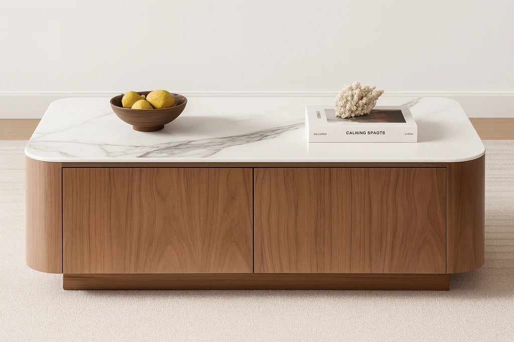 The Amber Coffee Table blends natural warmth with modern elegance. Material: Solid wood base with sintered stone top.Finish: Warm walnut base with... The Amber Coffee Table blends natural warmth with modern elegance. Material: Solid wood base with sintered stone top.Finish: Warm walnut base with glossy white marble surface.Features: Smooth rounded edges and concealed storage for a clean, modern look. View more
