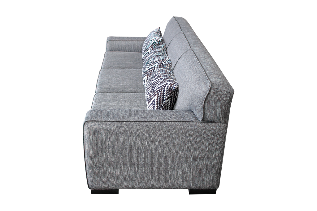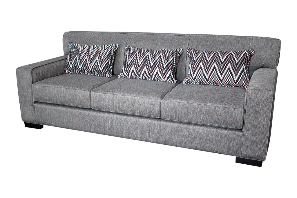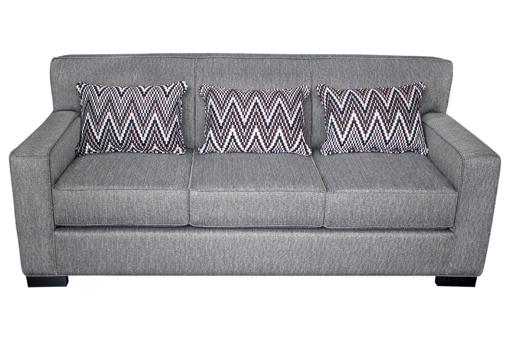This is a contemporary three-seater sofa bed upholstered in a textured gray fabric. It features clean, straight lines with plush... This is a contemporary three-seater sofa bed upholstered in a textured gray fabric. It features clean, straight lines with plush seat and back cushions for comfort. The sofa comes with three decorative throw pillows that showcase a bold zigzag pattern in black, white, and gray, adding a stylish accent to the overall design. The sturdy, low-profile legs provide strong support and a sleek silhouette. Customization Available:You can customize this sofa to perfectly match your home decor and personal style. Choose from a variety of fabric colors, patterns, and textures, as well as different cushion fillings and leg finishes. Whether you want a classic look or a vibrant statement piece, this sofa can be tailored to suit your needs. View more