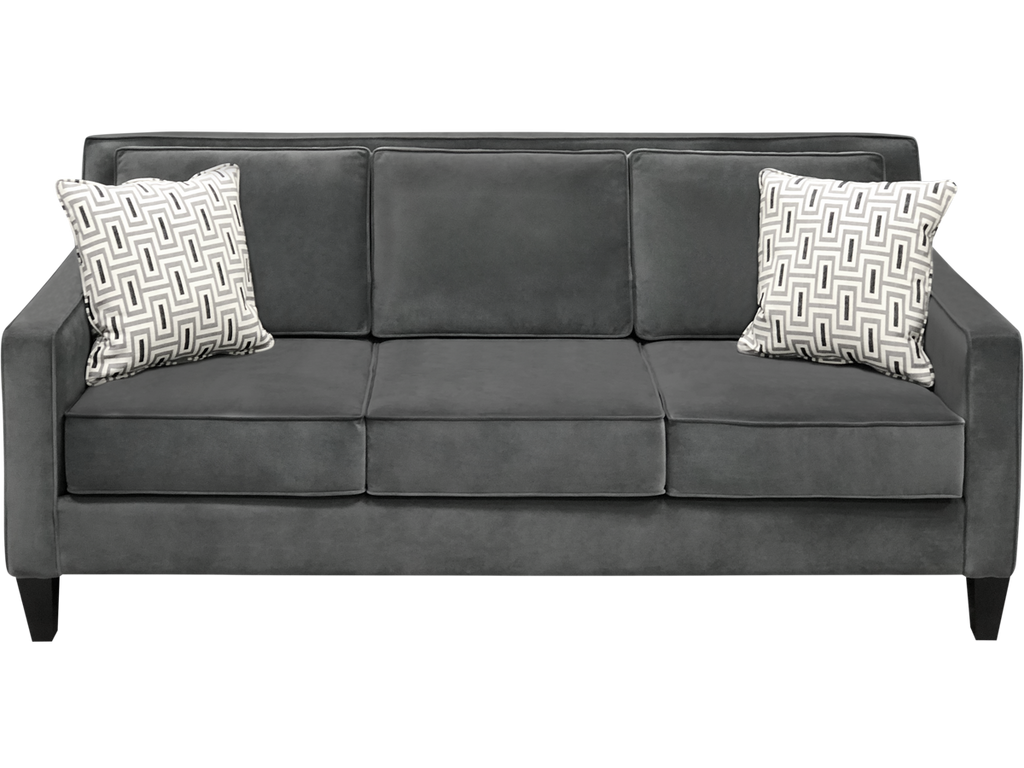A comfortable sofa featuring dark grey velvet upholstery, clean lines, and two geometric-patterned throw pillows for a touch of modern... A comfortable sofa featuring dark grey velvet upholstery, clean lines, and two geometric-patterned throw pillows for a touch of modern flair. The piece is complemented by dark wooden legs for a sleek finish. Fully customizable with different fabric options, colors, and pillow designs to suit your personal taste and home décor. Perfect for adding both style and comfort to any living room or lounge. The sofa can be customized where you can choose from a variety of fabrics, colors, and pillow patterns, so you can create a piece that perfectly matches your style and décor. View more