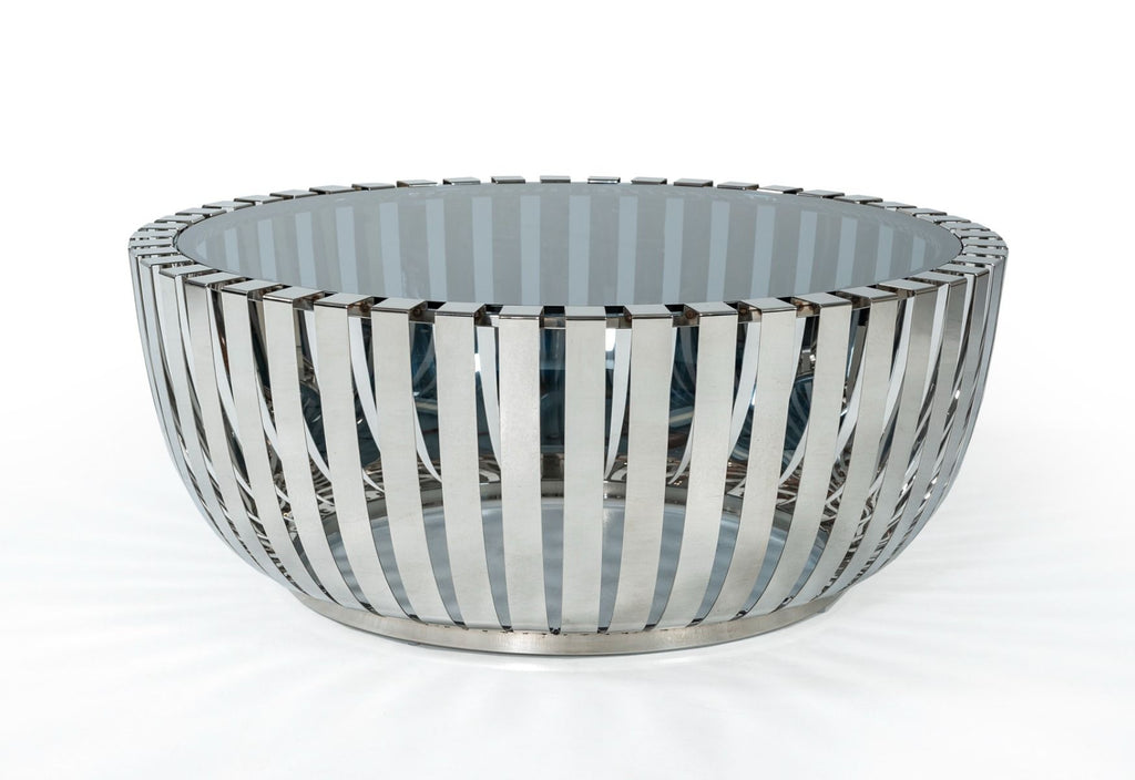 This intriguing coffee table would be the perfect addition to your living room. The 8 mm smoked glass top is... This intriguing coffee table would be the perfect addition to your living room. The 8 mm smoked glass top is perfectly highlighted by the circular cage-like stainless steel base, creating a soft yet stunning contrast. Matching end table available separately. Dimensions - W39" x D39" x H14.5" View more