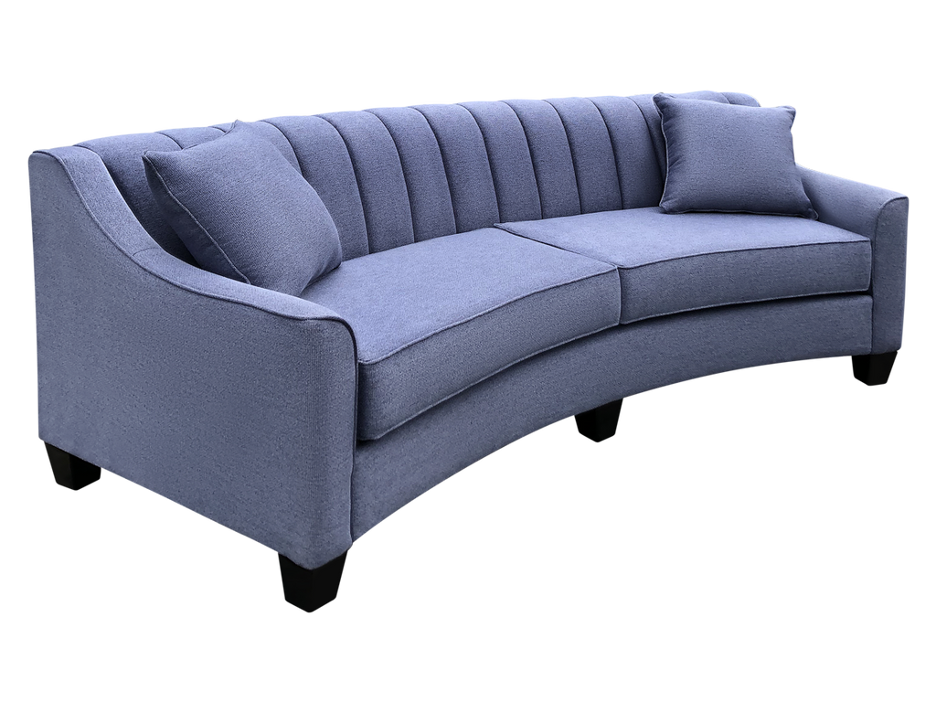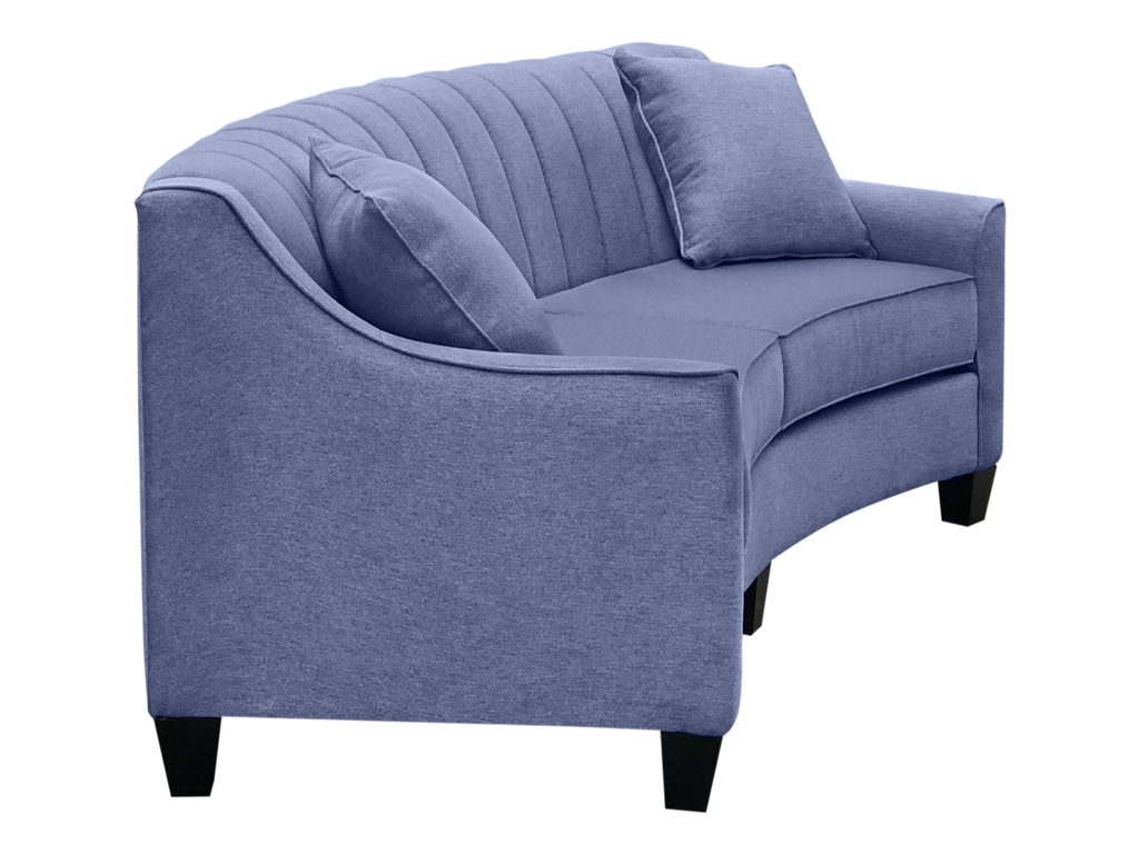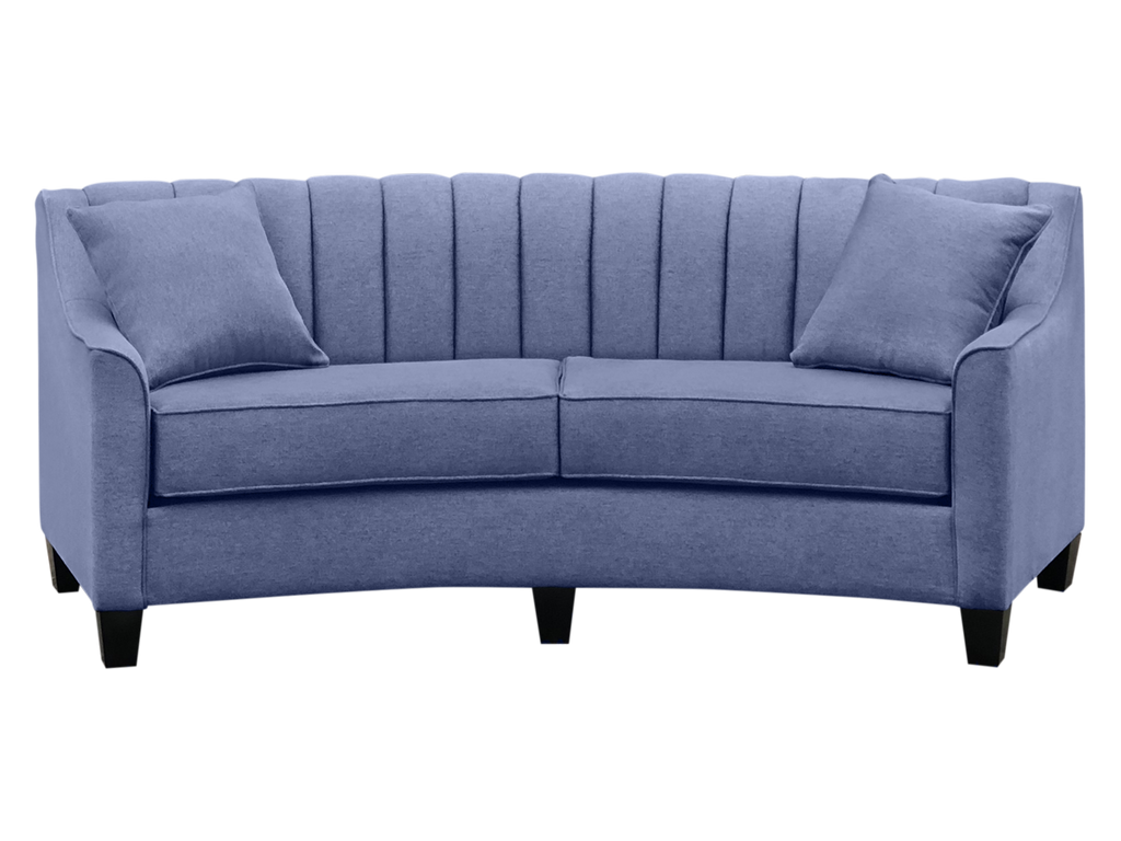 This stylish curved sofa features a soft, serene blue fabric that complements its elegant and modern design. The backrest is... This stylish curved sofa features a soft, serene blue fabric that complements its elegant and modern design. The backrest is accentuated with vertical channel tufting, adding texture and sophistication to the piece. It includes two matching throw pillows for added comfort and style. The sleek, black wooden legs provide a subtle contrast, enhancing the sofa's contemporary appeal. This sofa is fully customizable, allowing you to modify the fabric, color, and leg finishes to create a piece that perfectly aligns with your space and personal taste. View more