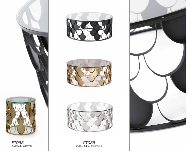 Coffee table features a striking cylindrical design with a base made up of overlapping, scale-like metal plates that create a... Coffee table features a striking cylindrical design with a base made up of overlapping, scale-like metal plates that create a visually textured and artistic pattern. The tabletop is crafted from glass, adding a sleek and elegant contrast to the intricate metalwork beneath. It is available in three finishes: black, gold, and silver, each paired with a clear or slightly tinted glass top. Measuring 1000 mm in diameter and 420 mm in height, this table blends modern sophistication with a unique decorative flair, making it a standout piece in any contemporary living space. View more