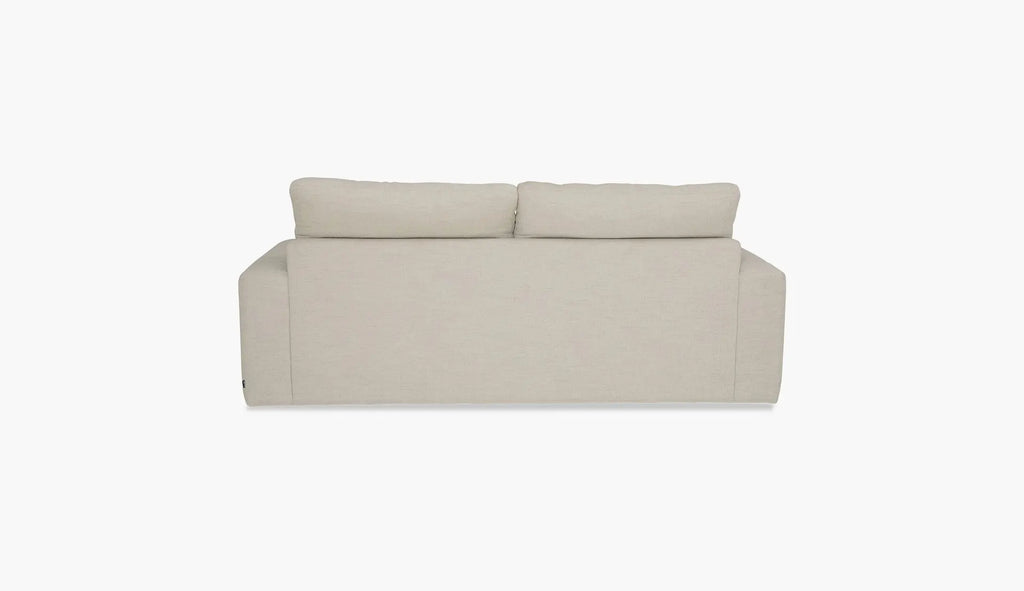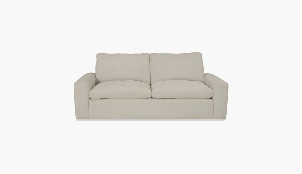 This sofa is a cozy, modern two-seater upholstered in a soft, light beige fabric. Its design emphasizes comfort with generously... This sofa is a cozy, modern two-seater upholstered in a soft, light beige fabric. Its design emphasizes comfort with generously padded seat and back cushions that have a slightly overstuffed appearance, inviting relaxation. The cushions are separated into two sections, creating a clean and balanced look. The armrests are wide and gently rounded, enhancing the sofa's plush and welcoming aesthetic. The base is fully upholstered, giving it a seamless and unified appearance without visible legs, which contributes to its grounded and substantial presence. Overall, this sofa combines casual comfort with a minimalist design, making it an ideal choice for relaxed living spaces. View more