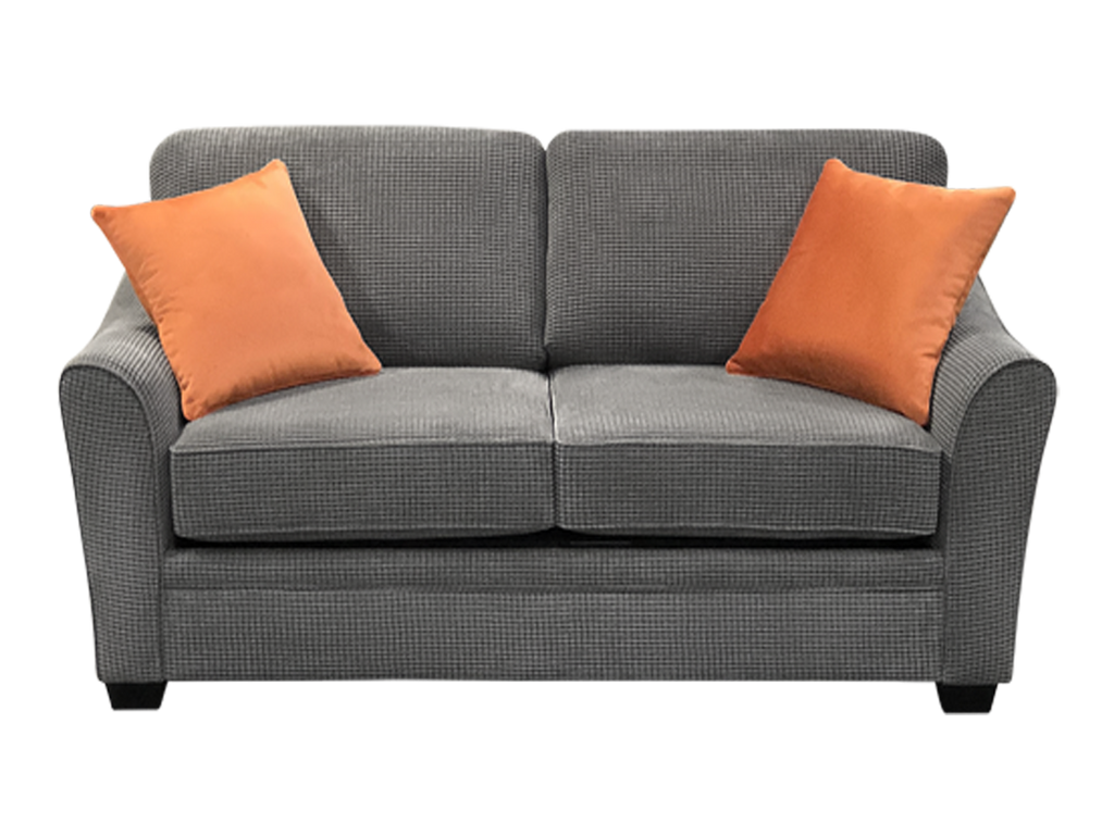 This is a cozy two-seater loveseat upholstered in a textured gray fabric with a subtle checkered pattern. It features gently... This is a cozy two-seater loveseat upholstered in a textured gray fabric with a subtle checkered pattern. It features gently rounded arms and plush seat and back cushions for added comfort. The loveseat is accented with two vibrant orange throw pillows, adding a pop of color and warmth to the design. The dark wooden legs provide sturdy support and a stylish contrast. Customization Available:You can customize this loveseat to perfectly suit your style and space. Choose from a variety of fabric colors and patterns, different cushion fillings, and leg finishes. You can also select pillow colors to match your personal decor, making this loveseat a unique and comfortable addition to your home. View more