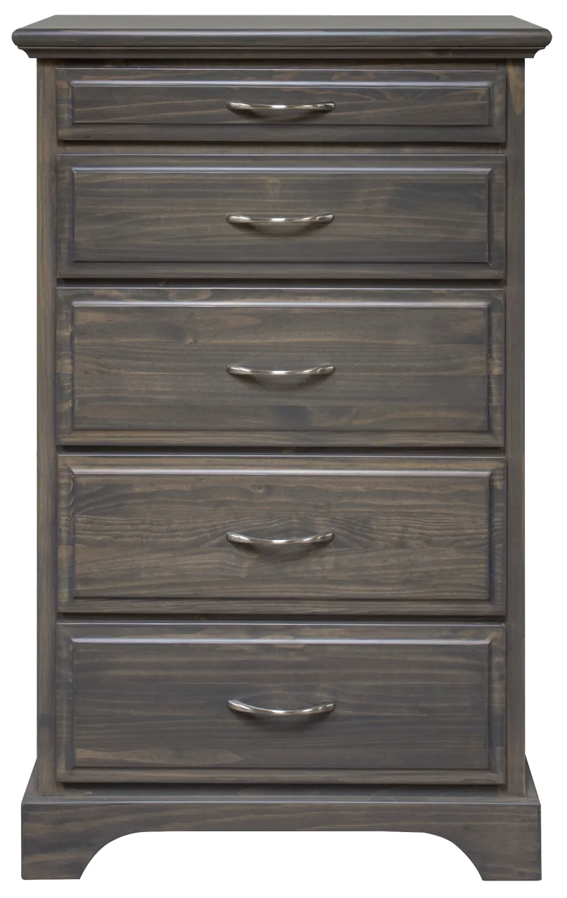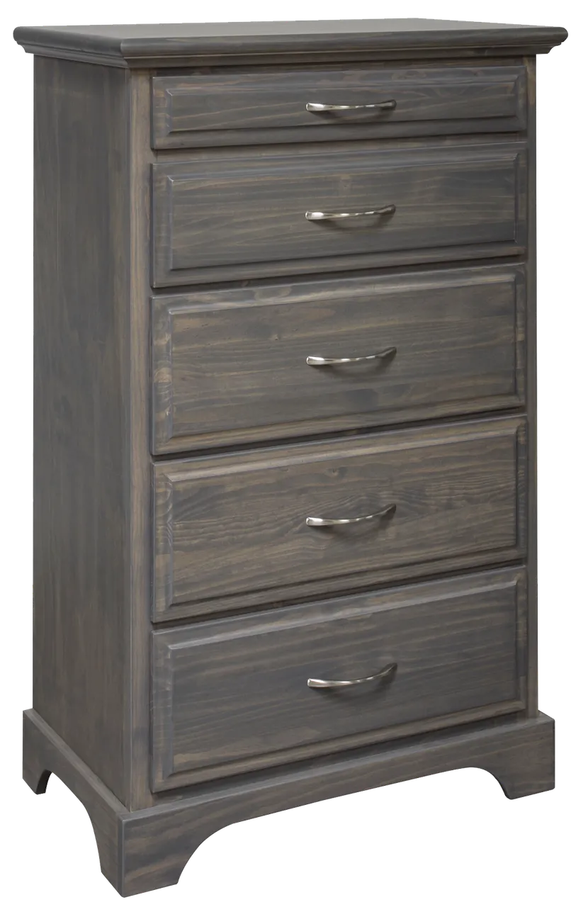 This is a five-drawer chest crafted in a classic design with a weathered gray wood finish, blending traditional craftsmanship with... This is a five-drawer chest crafted in a classic design with a weathered gray wood finish, blending traditional craftsmanship with a modern rustic touch. Each drawer features a framed front panel and is equipped with a sleek, curved metal handle in a brushed nickel or chrome finish, adding a subtle modern accent. The chest includes a compact top drawer, ideal for storing smaller items, while the remaining four larger drawers offer ample space for clothing or linens. The chest stands on a sturdy base with curved bracket feet and has a slightly crowned top edge, enhancing its elegant, timeless appeal. This piece is both functional and stylish, and it can be customized in finish, hardware, and dimensions to fit your specific needs and preferences. View more