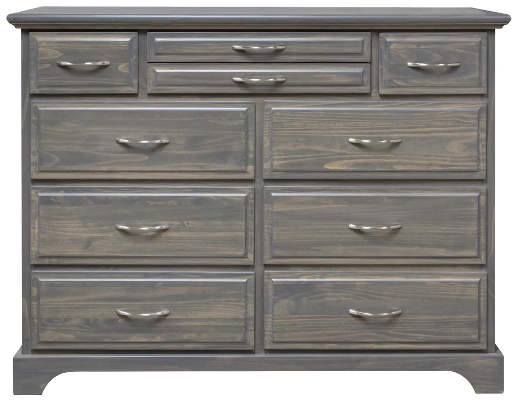 This is a nine-drawer dresser featuring a weathered gray wood finish that gives it a rustic yet refined look. The... This is a nine-drawer dresser featuring a weathered gray wood finish that gives it a rustic yet refined look. The dresser is designed with a mix of small and large drawers, offering versatile storage options. The top row includes three smaller drawers, perfect for organizing accessories.  Each drawer has a raised panel front and is fitted with sleek, curved metal handles in a brushed nickel finish. The dresser is accented with a crowned top edge and stands on a sturdy base with arched bracket feet, reinforcing its classic, durable construction. This piece combines timeless craftsmanship with modern functionality and can be an ideal addition to transitional, rustic, or traditional interiors. It is also customizable in terms of finish, hardware, and configuration to suit your specific style and storage needs. View more