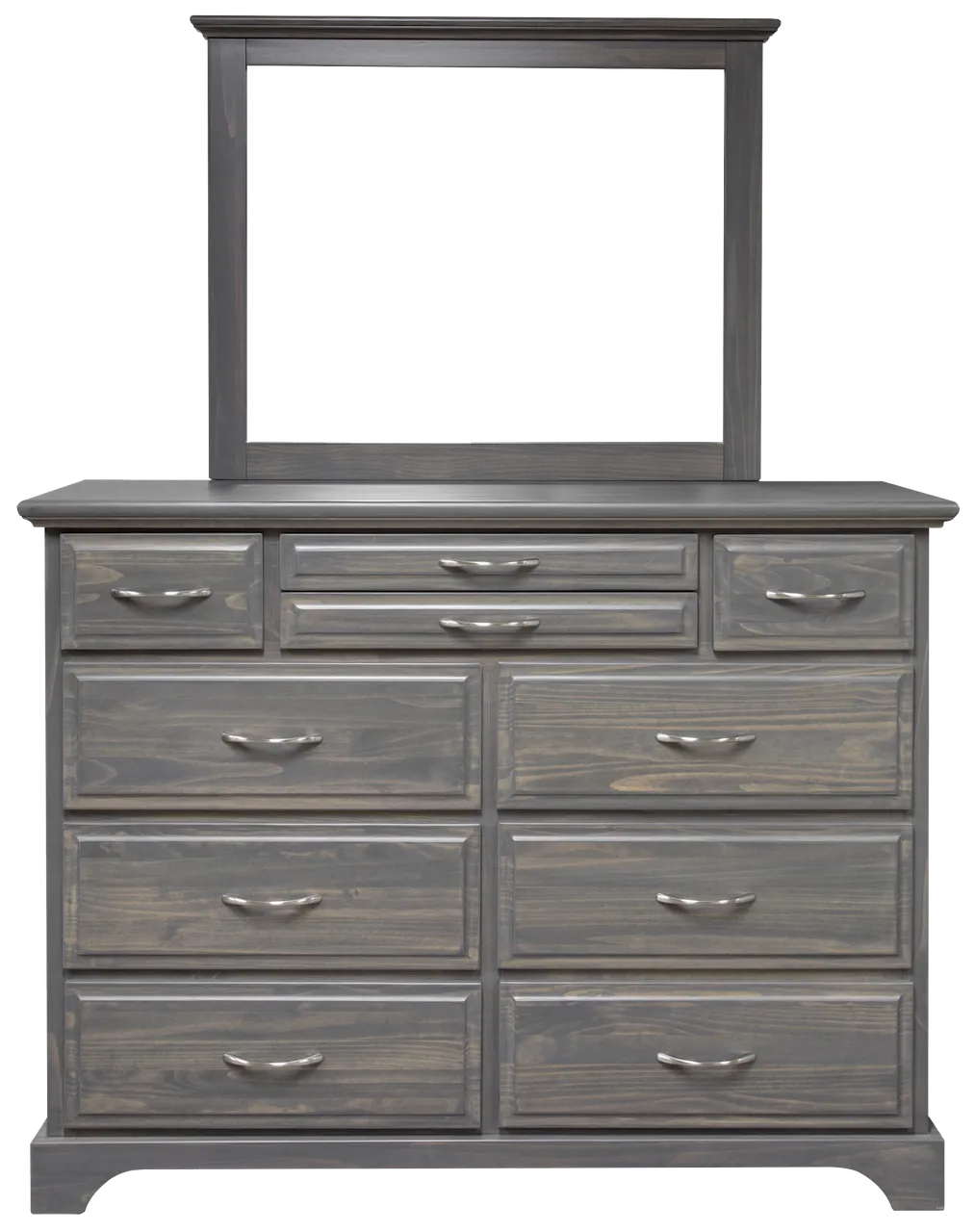 This is a gray wooden dresser with a matching rectangular mirror frame on top, designed in a rustic yet modern... This is a gray wooden dresser with a matching rectangular mirror frame on top, designed in a rustic yet modern style with visible wood grain patterns. It features ten drawers in total: three smaller drawers in the top row, including two stacked vertically in the middle, two larger side-by-side drawers in the middle section, and four equally sized large drawers at the bottom. Each drawer is equipped with a sleek silver handle, complementing the overall design. The dresser stands on a sturdy base with subtle cut-out details at the bottom corners.  View more