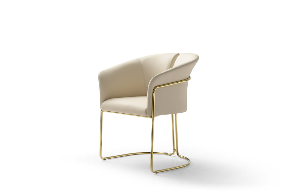 This lounge chair blends luxury and modern design with its refined and minimalist style. The seat is upholstered in soft,... This lounge chair blends luxury and modern design with its refined and minimalist style. The seat is upholstered in soft, cream-colored leather, offering a smooth and sophisticated touch, while the curved backrest and arms provide an inviting, comfortable experience. The chair’s structure is supported by a sleek, polished gold frame that adds a contemporary touch, enhancing its elegance and modern appeal. Its minimalist design, with clean lines and a delicate frame, allows this chair to seamlessly complement a variety of spaces, from living rooms to office settings View more