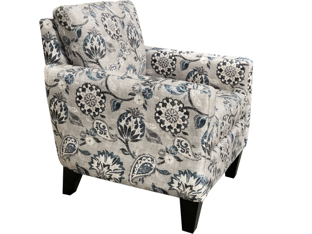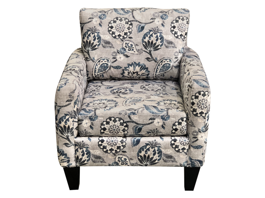 cushion. Upholstered in a beautifully patterned floral fabric with shades of blue, grey, and ivory, it adds a touch of... cushion. Upholstered in a beautifully patterned floral fabric with shades of blue, grey, and ivory, it adds a touch of elegance and warmth to any living space. The sturdy wooden legs and plush cushioning ensure both comfort and durability. Customization Available:Make it yours! This chair can be fully customized with your choice of fabric, color, and pattern to perfectly complement your home décor. View more