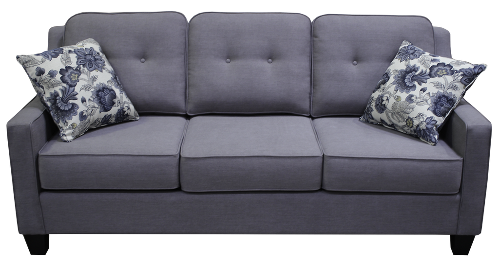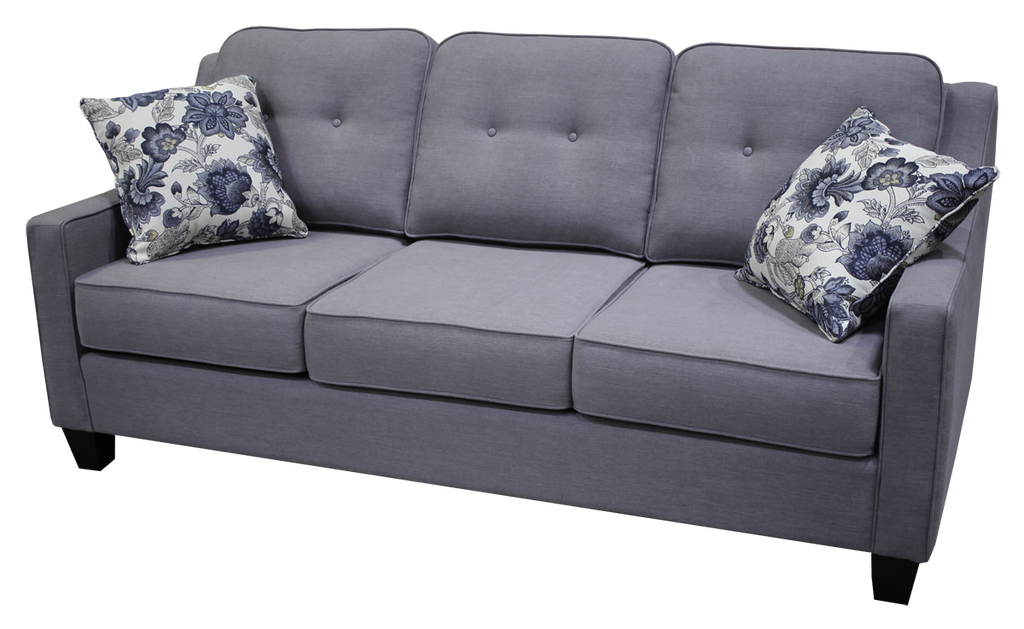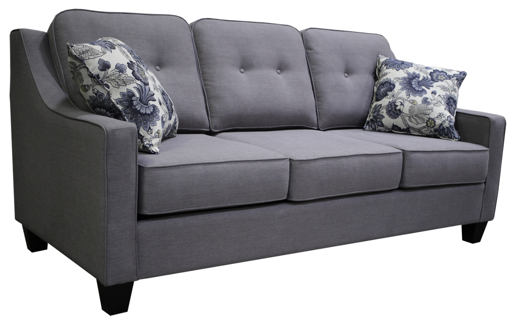 This is a stylish and comfortable three-seater sofa bed upholstered in a soft, muted gray fabric. It features three back... This is a stylish and comfortable three-seater sofa bed upholstered in a soft, muted gray fabric. It features three back cushions with subtle button tufting for a classic touch, and three matching seat cushions for ample seating space. The sofa includes two decorative throw pillows with an elegant floral pattern in shades of blue and gray, adding a charming accent to the design. The sleek, straight arms and dark wooden legs provide a modern yet timeless look. Customization Available:You can customize this sofa to match your unique style and home decor. Options include selecting from various fabric colors, textures, and patterns, changing the cushion firmness, and choosing different leg finishes. Pillow designs and colors can also be personalized to create a sofa that's truly yours. View more