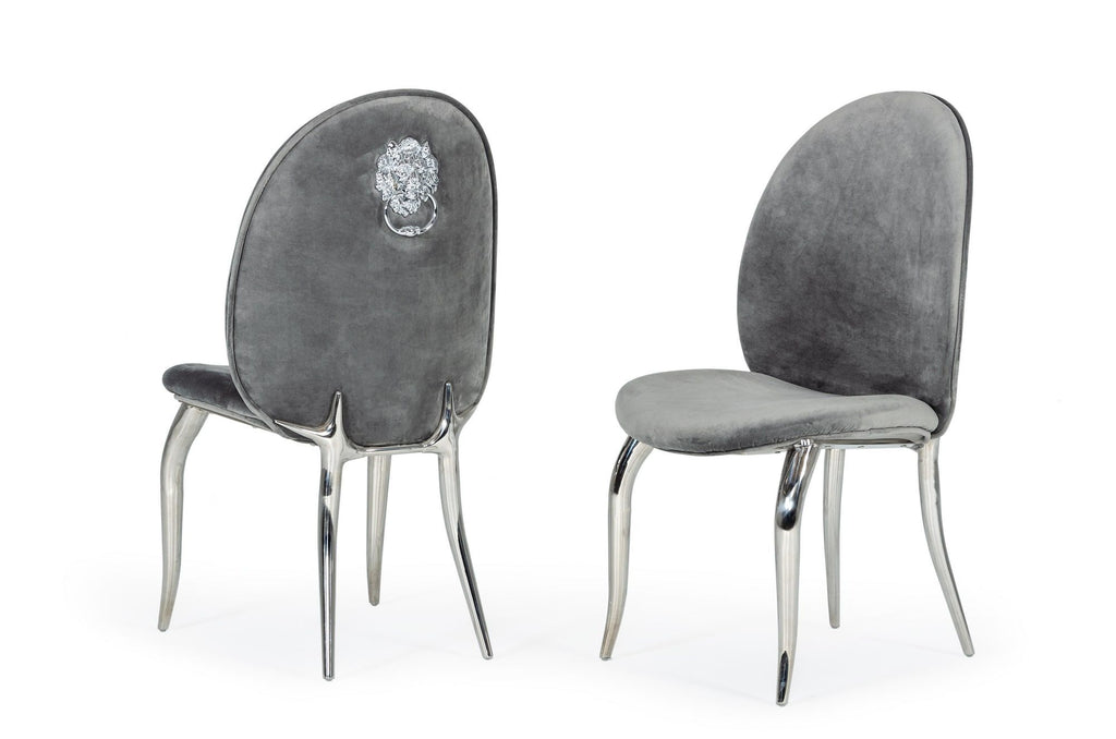 This opulent dining chair is the perfect blend of comfort and high-end design. Upholstered in soft, luxurious gray velvet, the... This opulent dining chair is the perfect blend of comfort and high-end design. Upholstered in soft, luxurious gray velvet, the chair provides a sophisticated and plush seating experience. The sleek, contoured backrest adds to the chair's elegance, complemented by striking, polished silver legs that taper down into a sculptural, fluid form. What truly makes this chair stand out is the intricate decorative silver ring at the back, embellished with a stunning crystal-like design that adds a touch of glamour and regality. This chair is also available in gold and beige.  View more