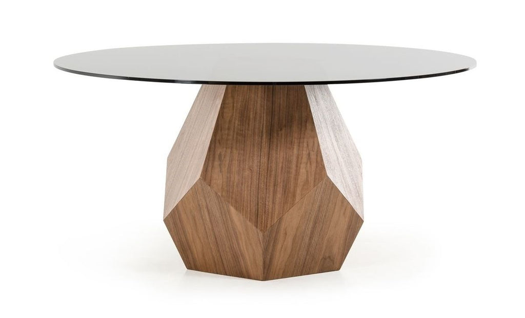 Dining Table: W59" x D59" x H30"Chair: W21" x D24" x H33"Arm Height: 27" Dining Set Includes: Dining Table +... Dining Table: W59" x D59" x H30"Chair: W21" x D24" x H33"Arm Height: 27" Dining Set Includes: Dining Table + 4 Chairs Smoked Glass Top Walnut Veneer Finished Base Round Upholstered in Fabric & Leatherette Color: Beige Fabric & Grey Leatherette Walnut Solid Ash Legs Some Assembly Required View more