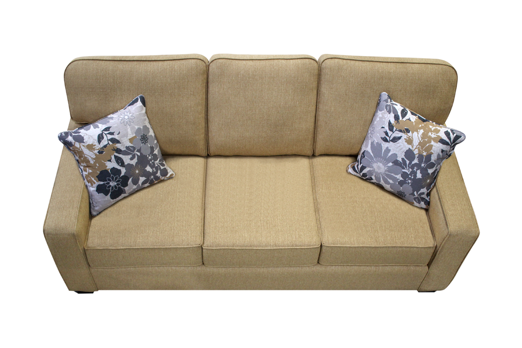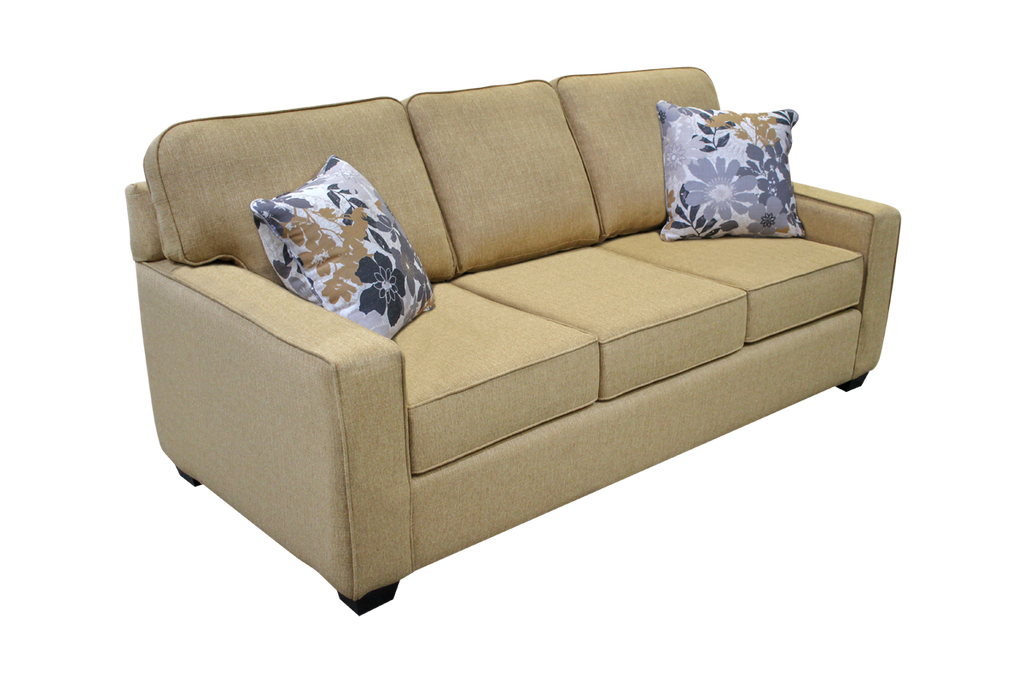 This warm and inviting sofa features a soft, mustard-yellow fabric that brings a cozy and contemporary feel to any living... This warm and inviting sofa features a soft, mustard-yellow fabric that brings a cozy and contemporary feel to any living space. The clean, boxy design is complemented by plush, comfortable cushions for a relaxed seating experience. It is paired with two decorative throw pillows adorned with a floral pattern in shades of grey, gold, and white, adding a touch of visual interest and elegance. The sofa rests on sleek, dark wooden legs, enhancing its modern appeal. This sofa is fully customizable, offering a variety of fabric options, colors, and pillow designs to perfectly match your style and home décor. You can adjust every detail to create a piece that suits your exact taste and needs. View more