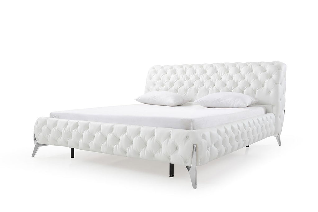 Set Includes: bed, two nightstands, dresser and mirror Upholstered In White Bonded Leather Diamond Tufted Polished Stainless Steel Legs Slats... Set Includes: bed, two nightstands, dresser and mirror Upholstered In White Bonded Leather Diamond Tufted Polished Stainless Steel Legs Slats Included - No Box Spring Required Assembly Required Case goods: White Lacquer Crocodile Textured Finish Drawers Rounded Metal Drawer Pulls Queen Bed: W76" x D94" x H44"Eastern King Bed : W86" x D94" x H44"Nightstand: W31.5" x D18" x H18.5"Dresser: W63" x D18" x H26"Mirror: W47.2" x D2.35" x H47.2" View more