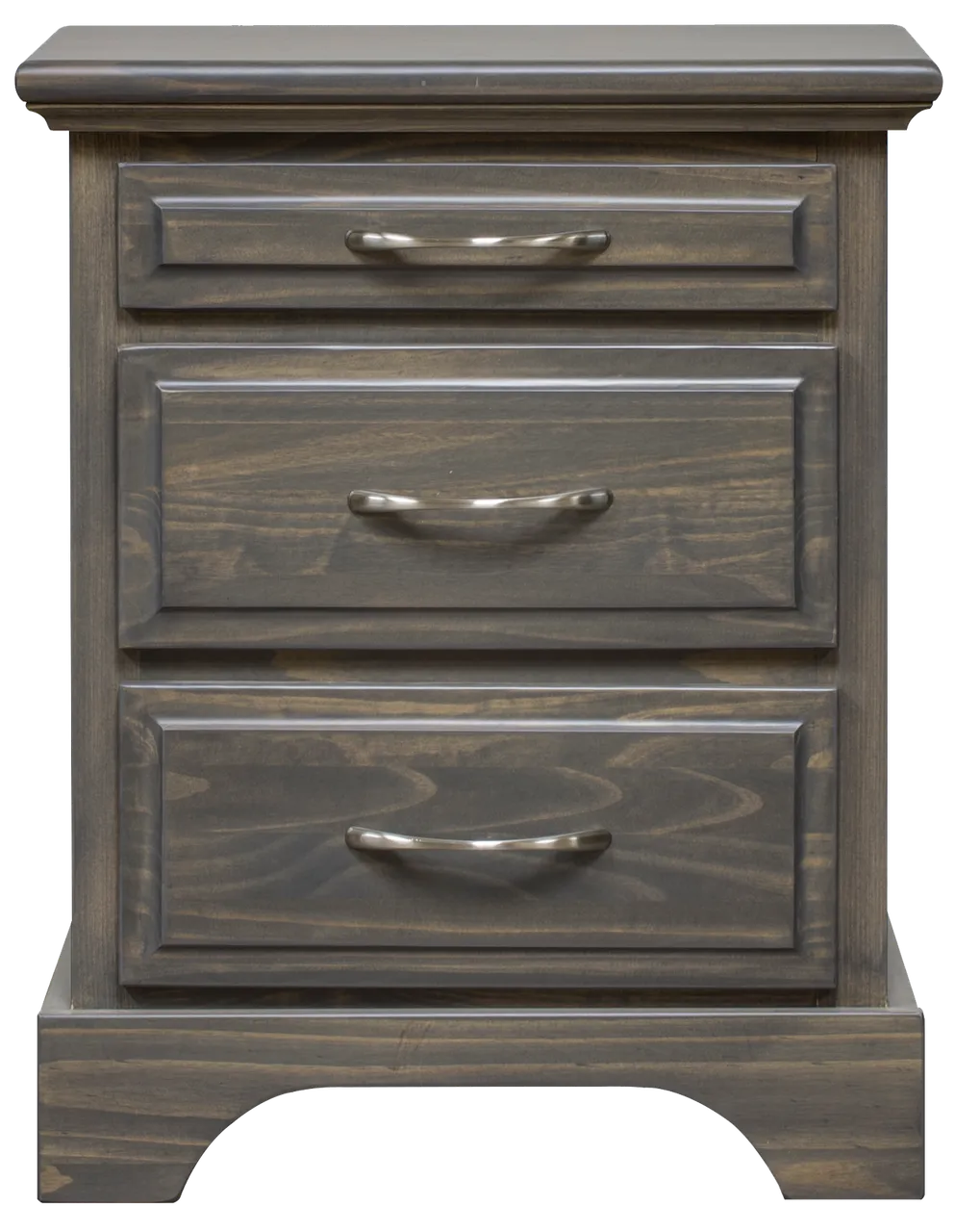 This nightstand features a traditional design with a modern touch, crafted from wood and finished in a dark, weathered gray... This nightstand features a traditional design with a modern touch, crafted from wood and finished in a dark, weathered gray tone that highlights the natural grain. It includes three equally sized drawers, each adorned with raised panel fronts and sleek, curved metal handles in a brushed nickel finish. The top surface is flat with gently rounded edges, providing a practical space for bedside essentials like a lamp or alarm clock. The base is designed with decorative cutout arches on each side, adding an elegant and classic touch to the overall look. This piece offers both style and functionality, making it a versatile addition to any bedroom setting. View more