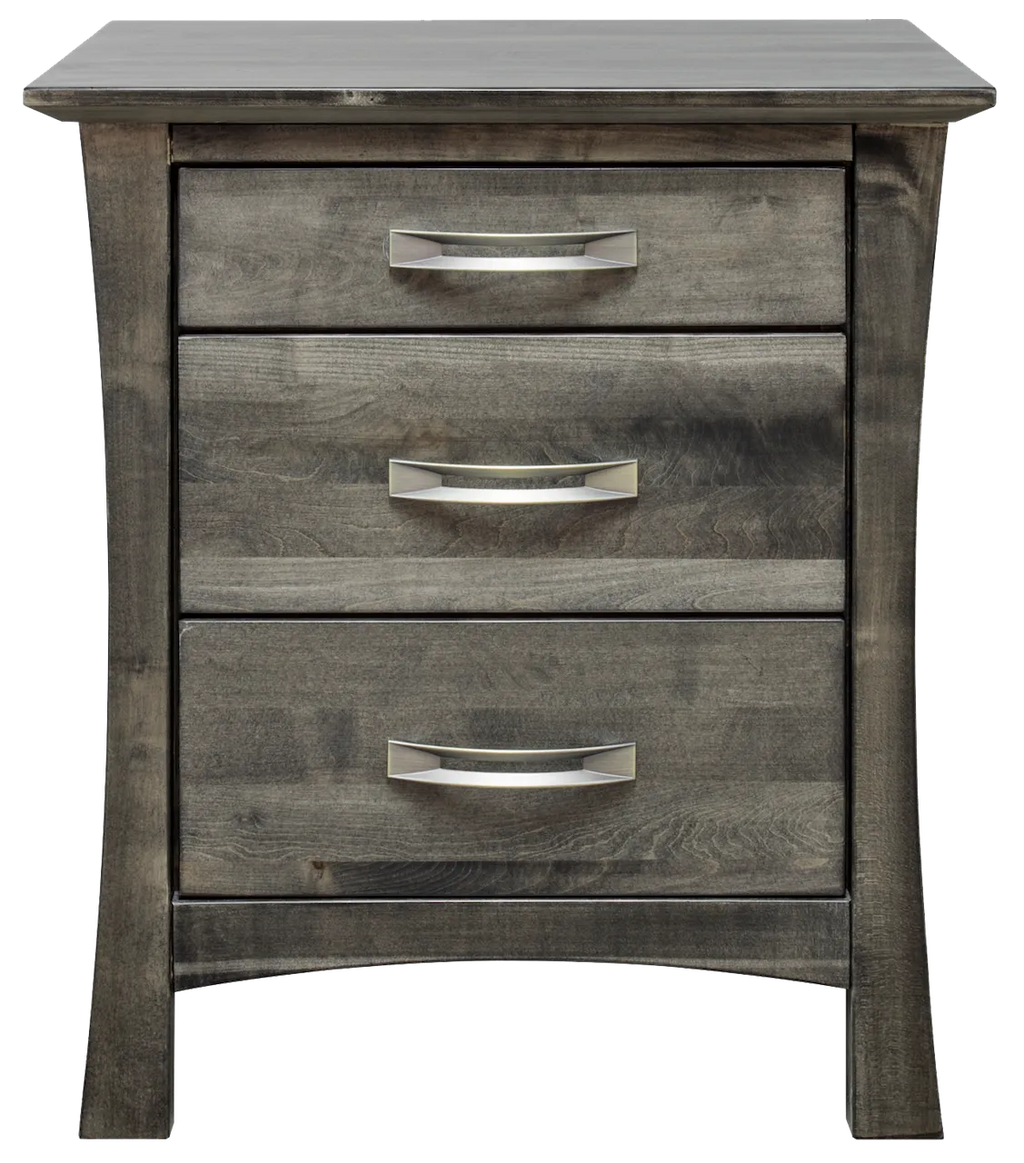 This is a stylish and functional three-drawer nightstand that blends modern and rustic design elements. Crafted from solid wood, it... This is a stylish and functional three-drawer nightstand that blends modern and rustic design elements. Crafted from solid wood, it features a weathered gray finish that highlights the natural grain patterns, adding warmth and character to its clean-lined silhouette. The piece is equipped with three spacious drawers, each accented by sleek, curved metal handles in a brushed nickel finish, offering a subtle contemporary flair. A standout feature of this nightstand is that it is fully customizable. You can personalize elements such as the wood finish, hardware style, and size to match your individual taste or existing bedroom décor. View more