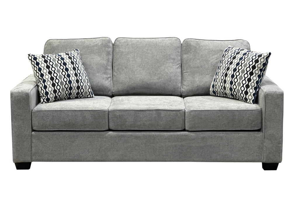 This modern sofa showcases a soft grey fabric that blends both comfort and style. Its simple, boxy shape is complemented... This modern sofa showcases a soft grey fabric that blends both comfort and style. Its simple, boxy shape is complemented by plush cushions and sleek square arms, offering a clean and minimalist appearance. The sofa comes with two decorative throw pillows featuring a bold geometric design, adding a touch of contrast and visual interest. Supported by dark wooden legs, it provides both durability and a refined look. Fully customizable, this sofa lets you select from a wide range of fabric choices, colors, and pillow patterns, allowing you to design a piece that fits your unique style and home decor. Whether you're looking for a different hue or texture, you can easily tailor this sofa to suit your needs. View more