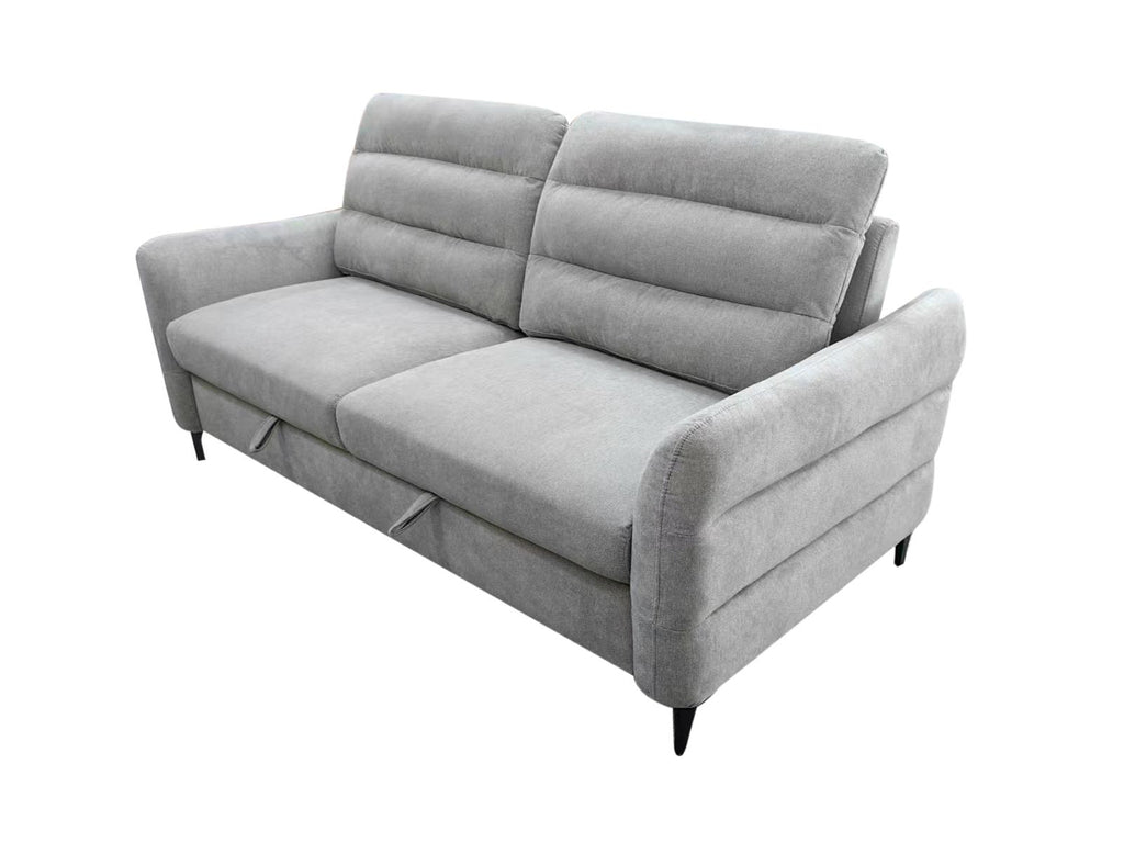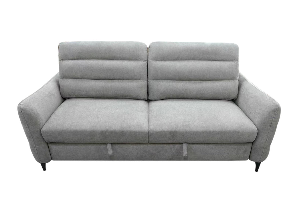 A modern convertible sofa bed upholstered in light grey fabric. It features a pull-out extension mechanism that transforms the sofa... A modern convertible sofa bed upholstered in light grey fabric. It features a pull-out extension mechanism that transforms the sofa into a flat sleeping surface, making it ideal for guests or small living spaces. The backrest cushions are horizontally channeled for added support and style, and the armrests are softly curved for comfort. The sofa stands on slim, black legs, giving it a sleek and contemporary appearance. When extended, it offers a spacious and cushioned area suitable for lounging or sleeping, combining functionality with a clean, minimalist design. View more