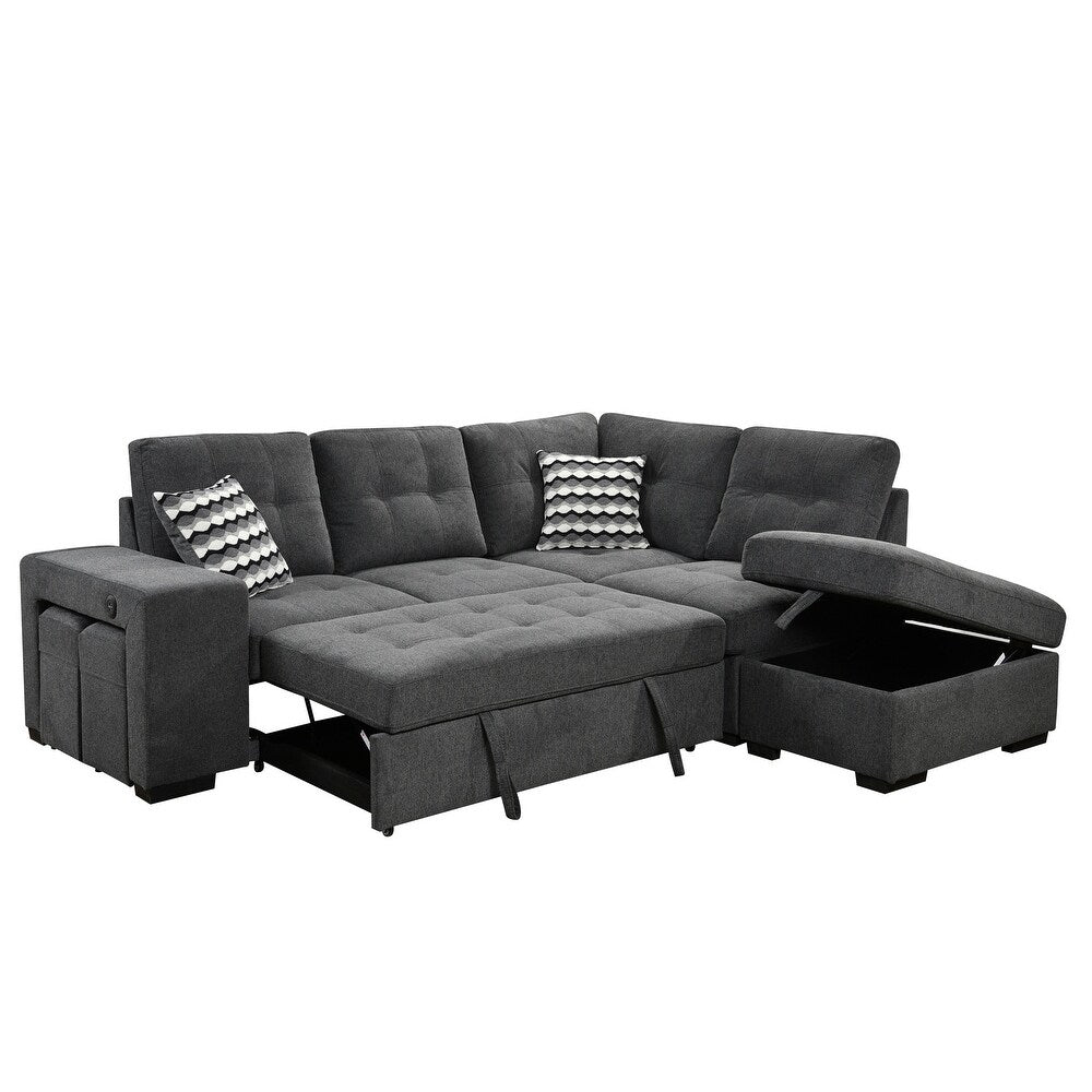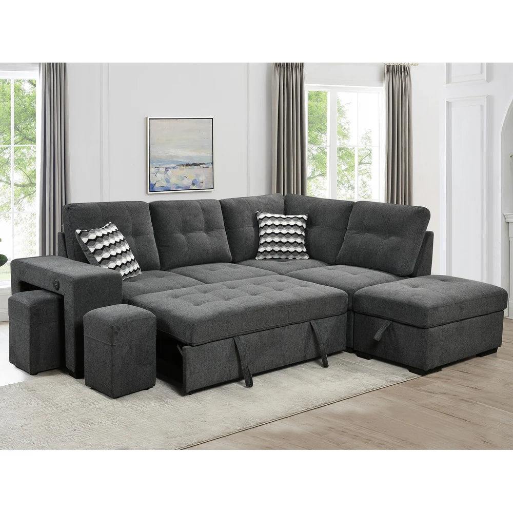 This is a modern L-shaped sectional pull-out sofa in a dark charcoal gray fabric, designed for both style and functionality.... This is a modern L-shaped sectional pull-out sofa in a dark charcoal gray fabric, designed for both style and functionality. The sofa features a pull-out bed mechanism that transforms the main seating area into a spacious sleeping surface, making it ideal for guests or small living spaces. It includes a right-side chaise lounge with hidden storage under the seat, perfect for storing bedding or other essentials. The sofa comes with two compact storage ottomans that can be used as footrests or extra seating.  The cushions are button-tufted for a tailored, plush look, and the set is completed with three decorative throw pillows in a bold black, white, and gray geometric pattern. This versatile and contemporary piece combines comfort, storage, and modern design, making it a practical addition to any home. View more
