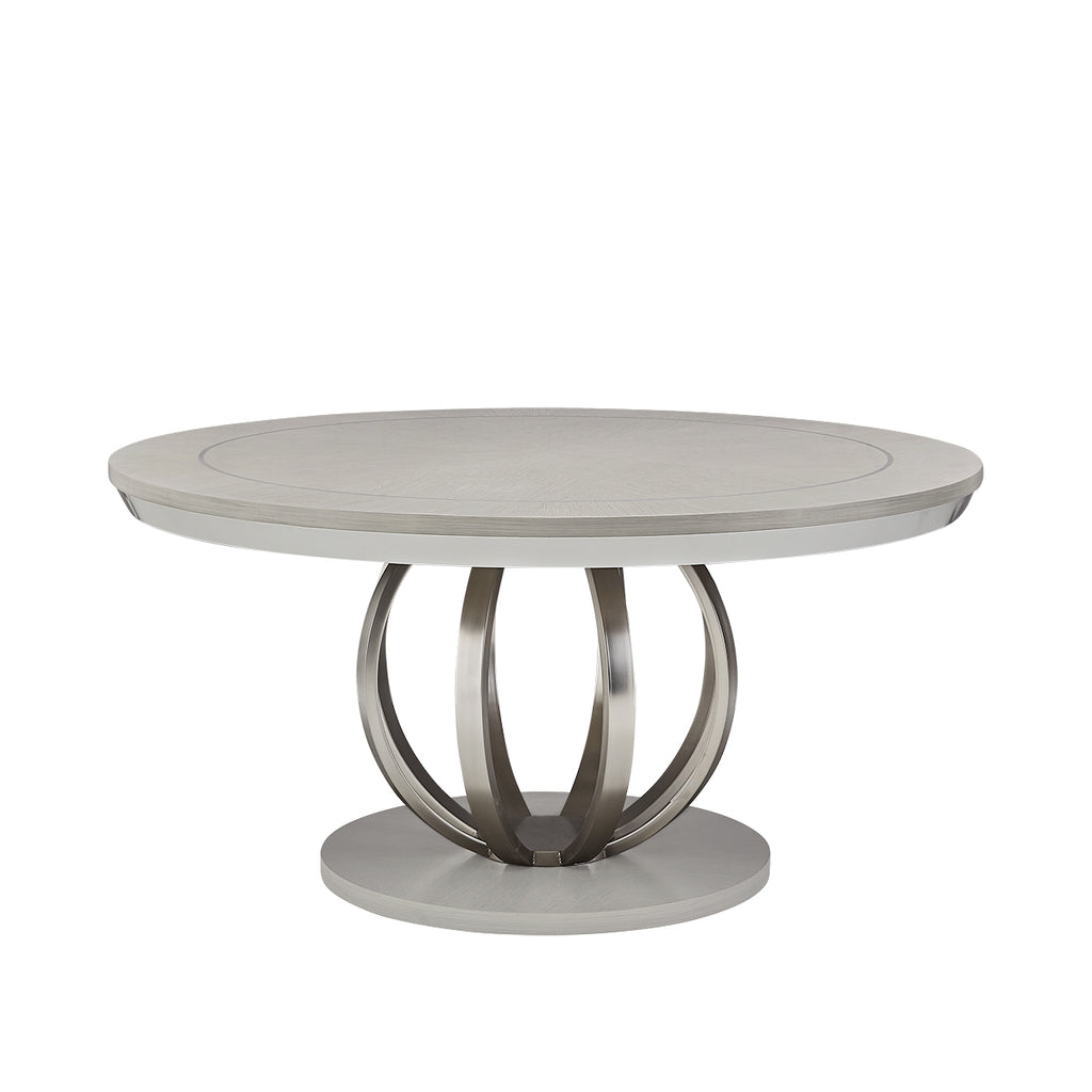 This is a modern round table with a unique and stylish design. The tabletop appears to be made of a... This is a modern round table with a unique and stylish design. The tabletop appears to be made of a light-colored wood or wood-like material with a subtle grain pattern and a thin circular border detail near the edge. The base of the table consists of several curved metal strips arranged in a spherical shape, providing a contemporary and artistic look. The metal strips connect the round tabletop to a circular base that matches the color and material of the tabletop. Overall, the table combines light wood tones with sleek metallic elements for a sophisticated, modern aesthetic. View more