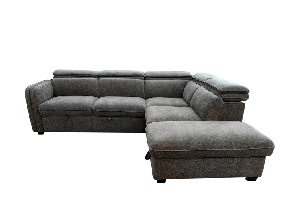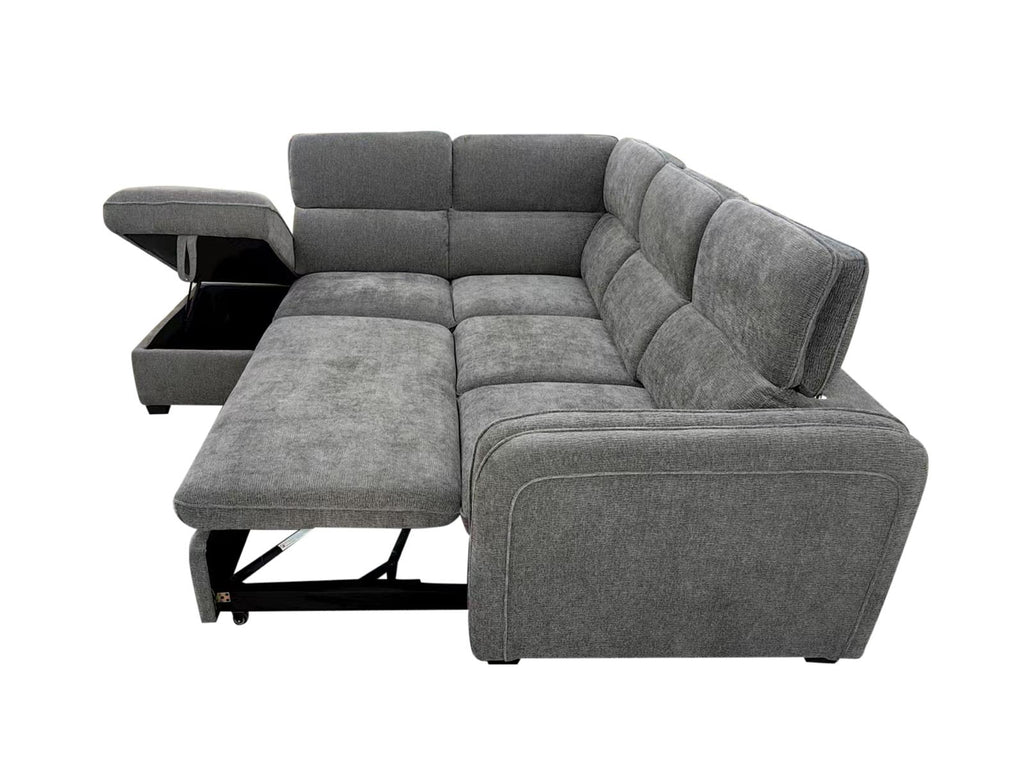 A modern L-shaped sectional sofa upholstered in a soft, grey fabric. It features a pull-out bed section that allows it... A modern L-shaped sectional sofa upholstered in a soft, grey fabric. It features a pull-out bed section that allows it to convert easily into a sleeping surface, making it ideal for guest use or small living spaces. The right-side chaise includes a built-in storage compartment under the seat, providing a convenient space to store blankets, pillows, or other household items. The sofa is designed with thick, cushioned backrests and seats, offering both comfort and support. With its clean lines and practical functionality, this sofa combines contemporary style with everyday convenience. View more