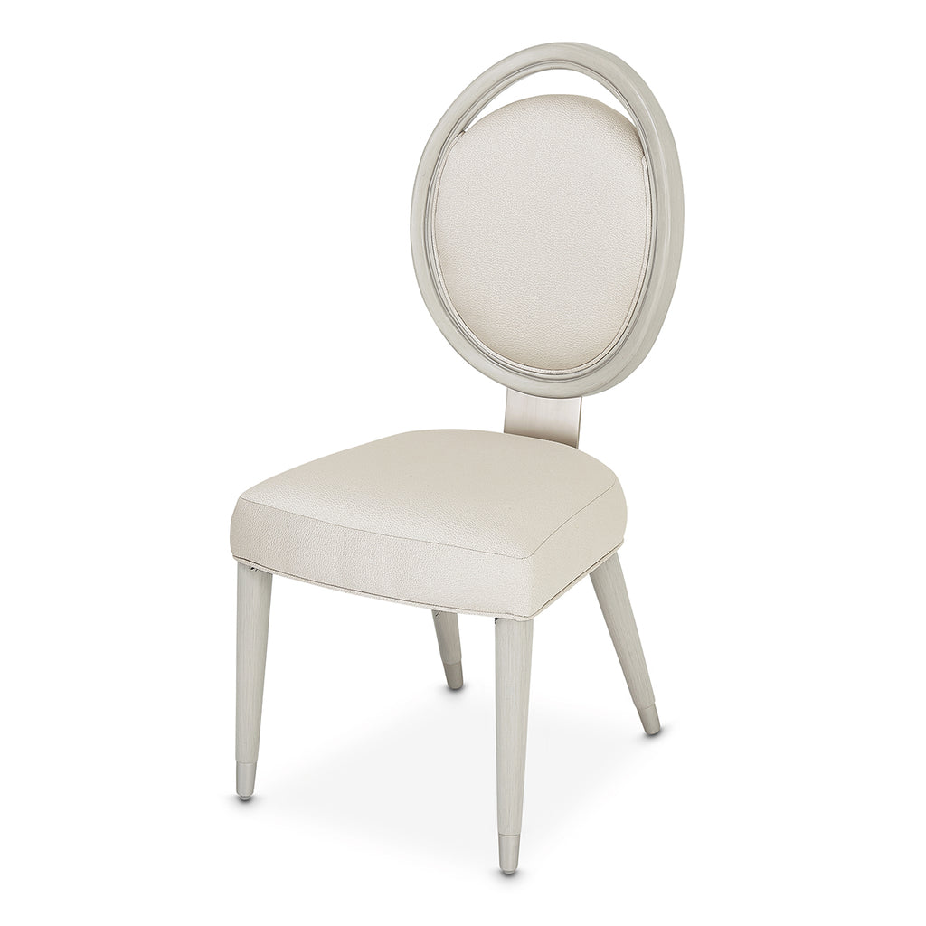 This is a stylish chair with a modern yet classic design. It has a round, oval-shaped backrest that is cushioned... This is a stylish chair with a modern yet classic design. It has a round, oval-shaped backrest that is cushioned and upholstered in a light beige or cream-colored material, likely faux leather or leatherette. The seat is also cushioned and covered with the same material. The chair’s frame and legs are made of wood with a light gray or off-white finish, giving it a clean and elegant look. The legs are tapered, adding a touch of sophistication. Overall, this chair combines comfort and elegance, making it suitable for dining rooms, living spaces, or even offices View more