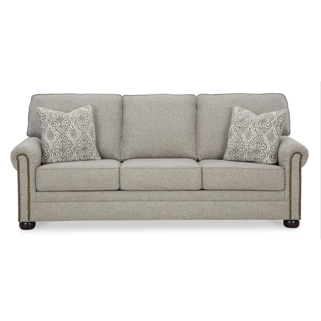 Inspired by the past but rooted firmly in the present, this sofa complements your transitional seating area. Its versatile upholstery... Inspired by the past but rooted firmly in the present, this sofa complements your transitional seating area. Its versatile upholstery is delightfully detailed for a subtle herringbone effect. Designer touches like decorative nailhead trim and bun legs add traditional character. With this sofa's reliable style and comfort, all you need to do is sit back and relax. Loveseat, chair and ottoman included. View more