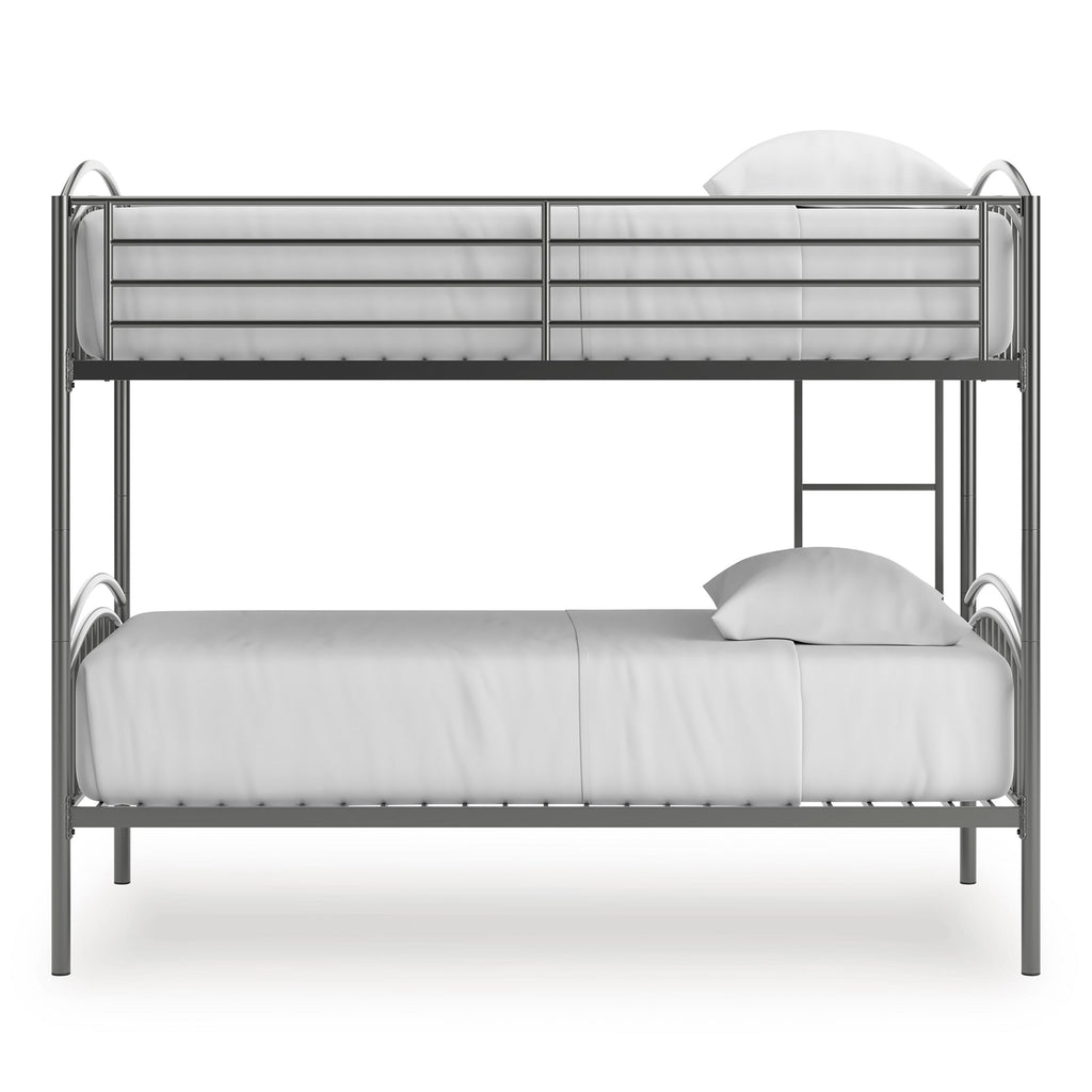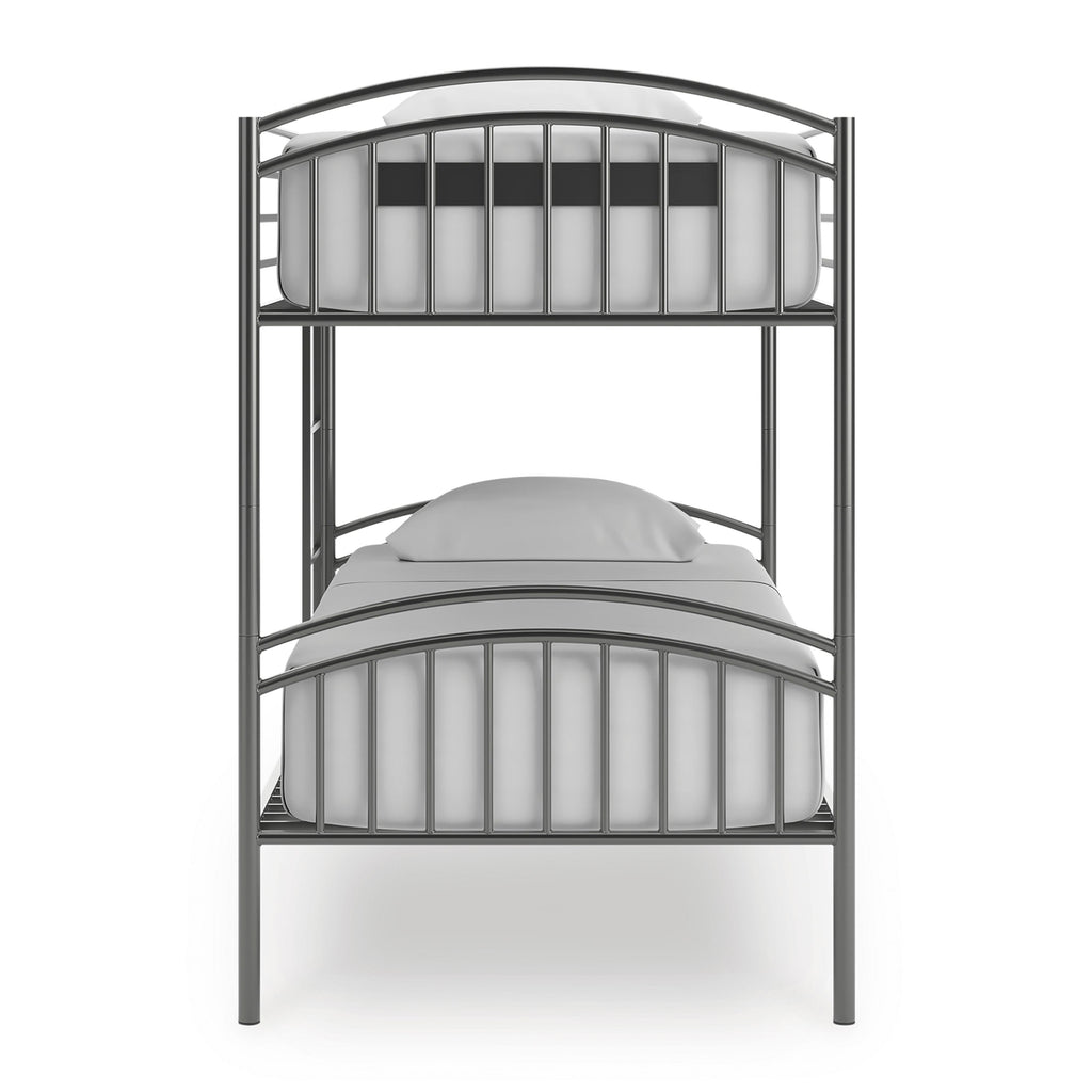 Save space and let little ones snooze in style. This bunk bed's steel gray finish pairs with a variety of... Save space and let little ones snooze in style. This bunk bed's steel gray finish pairs with a variety of colors and aesthetics. Its ladder position adjusts to the left or right side to suit a bedroom's layout. And the bed is adaptable to your family's changing needs, with the ability to convert from a bunk bed to two individual twin beds. View more