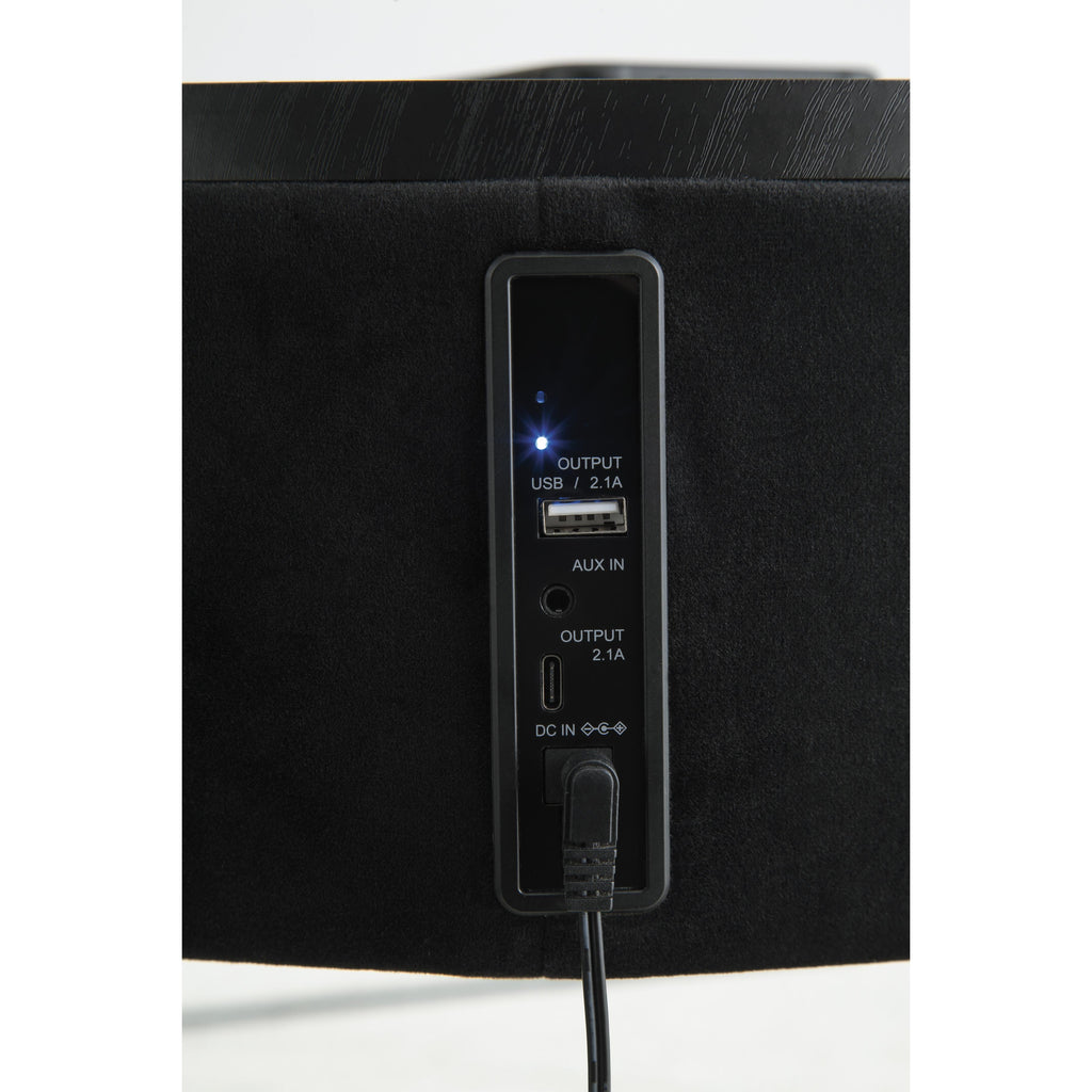 Discover the perfect combination of contemporary style and space-saving functionality. This accent table is designed with an integrated speaker (complete... Discover the perfect combination of contemporary style and space-saving functionality. This accent table is designed with an integrated speaker (complete with wireless charging and touch-button controls), allowing you to effortlessly stream your favorite tunes wirelessly. Its sleek glass top perfectly complements the modern black fabric on the sides. This table is gonna be music to your ears. View more