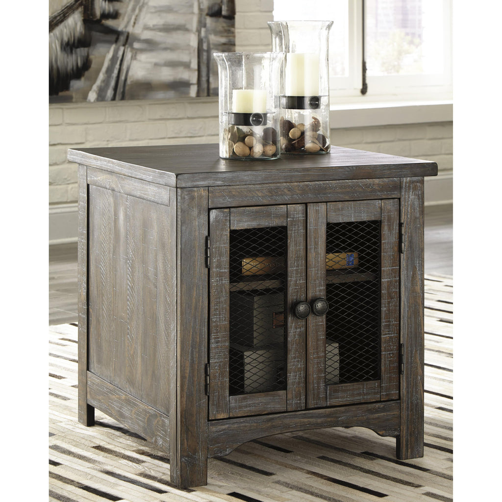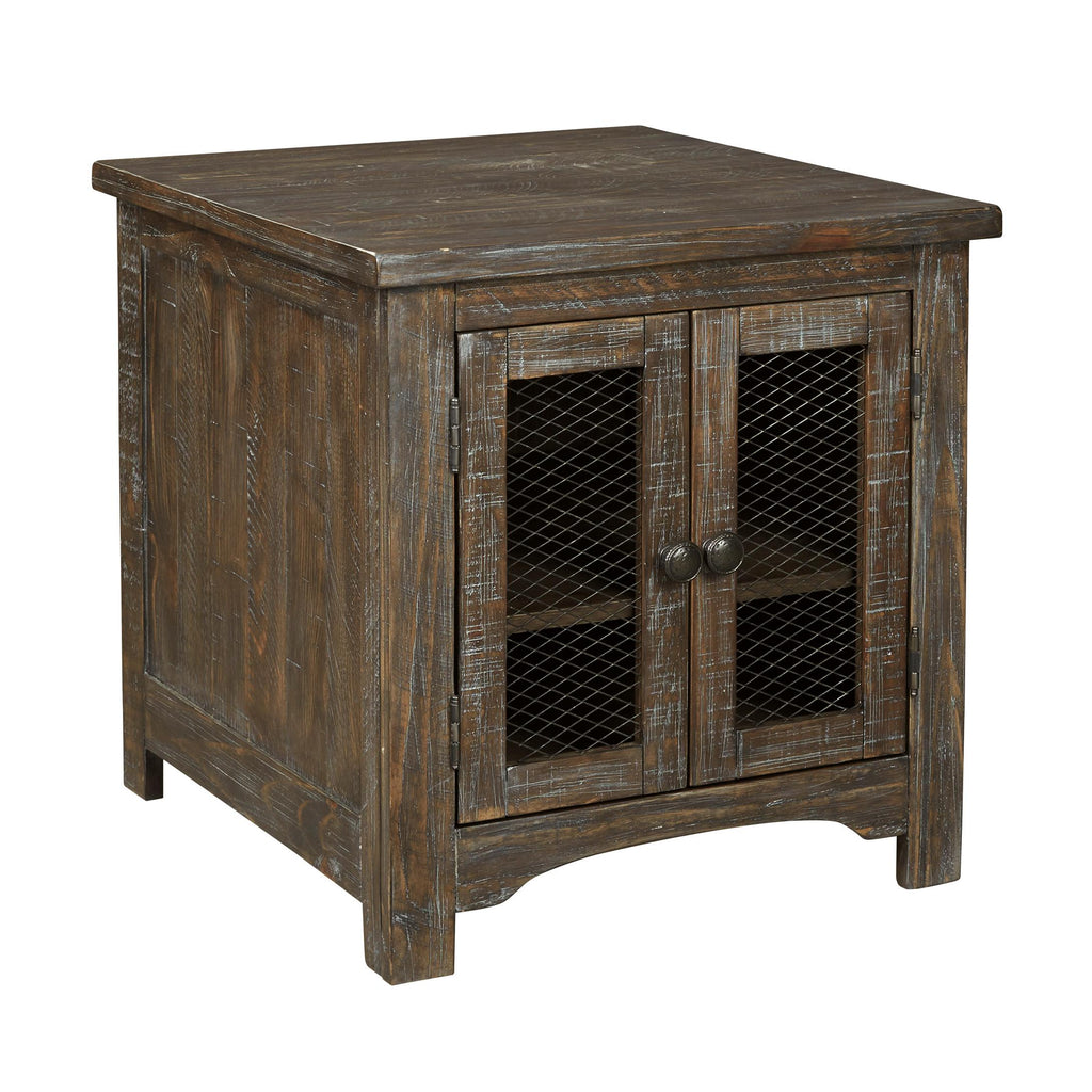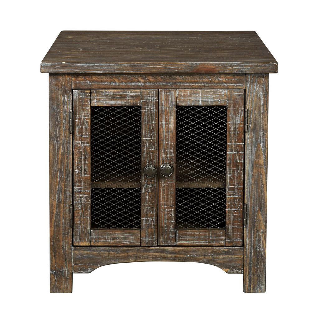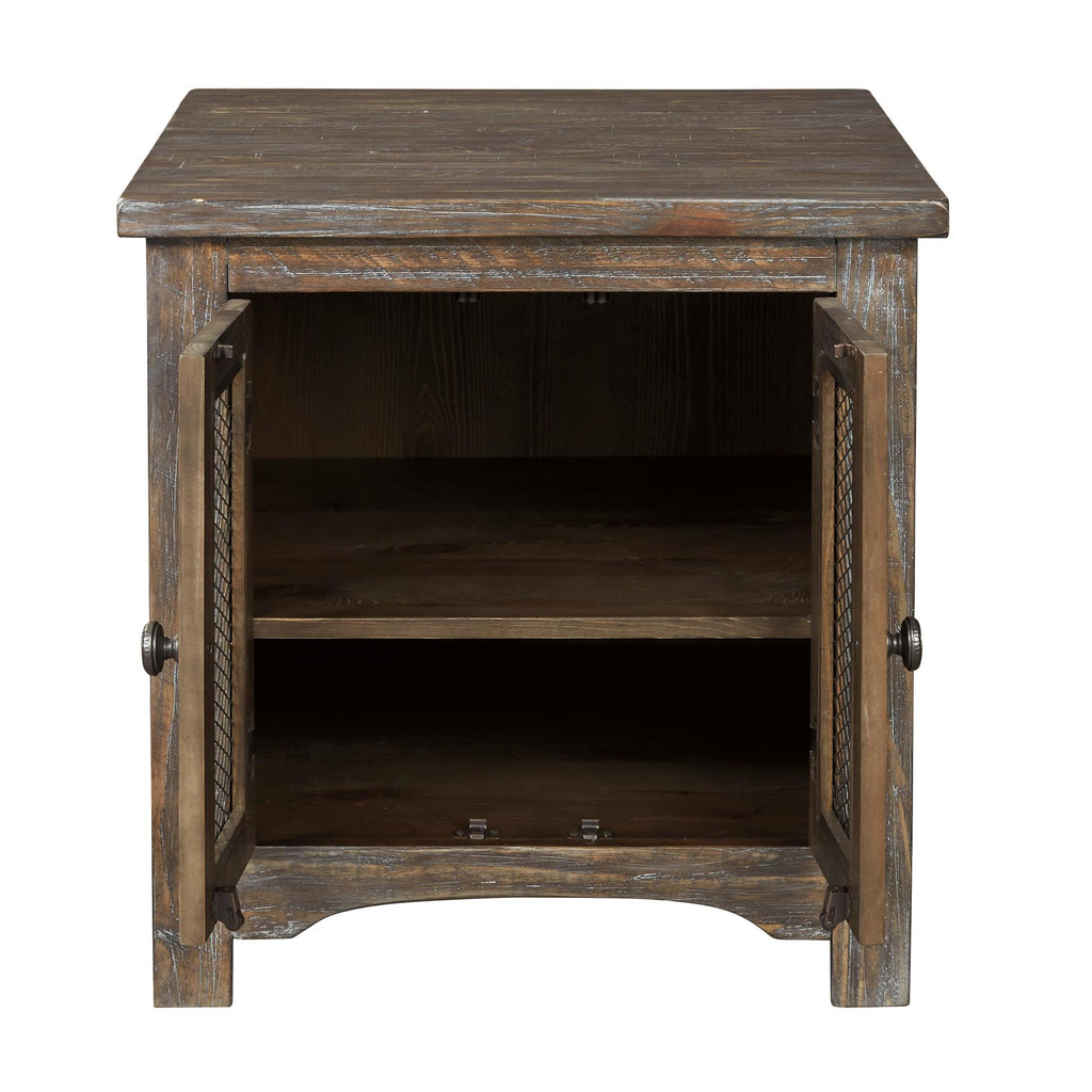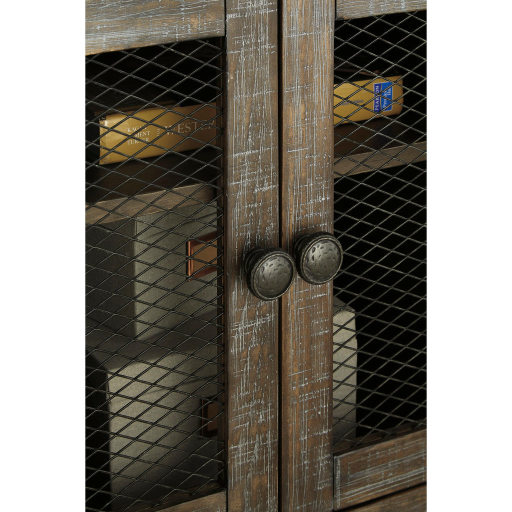 • Double cabinet doors with inset wire mesh revealing single-shelf storage