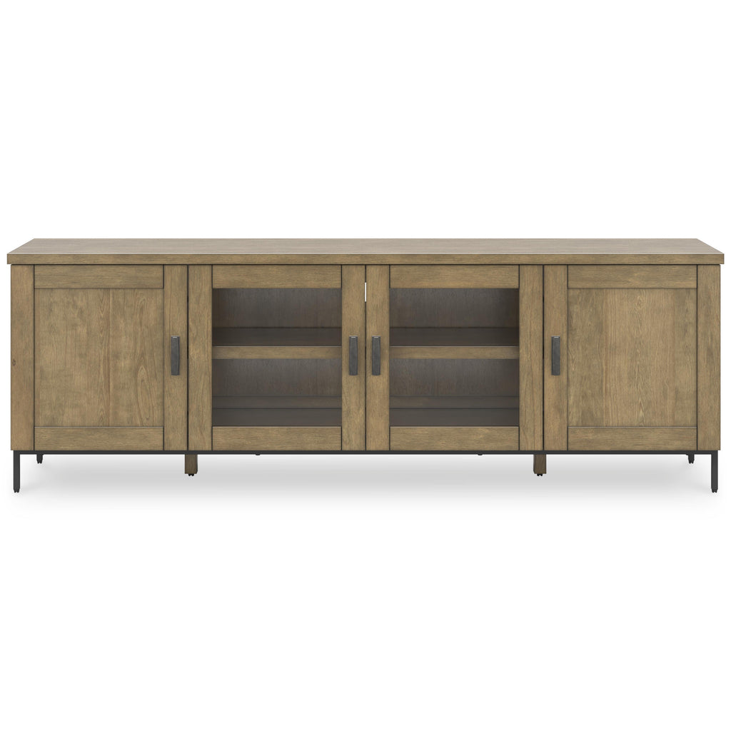 Made for the everyday, this TV stand is a sleek complement to your casual contemporary living room. You’ll love the... Made for the everyday, this TV stand is a sleek complement to your casual contemporary living room. You’ll love the refined-yet-relaxed vibe of its contrasting medium brown finish and matte black legs. Concealed and glass-front cabinets make media storage a breeze. And for added function, cord management holes throughout the piece make connections easier. View more