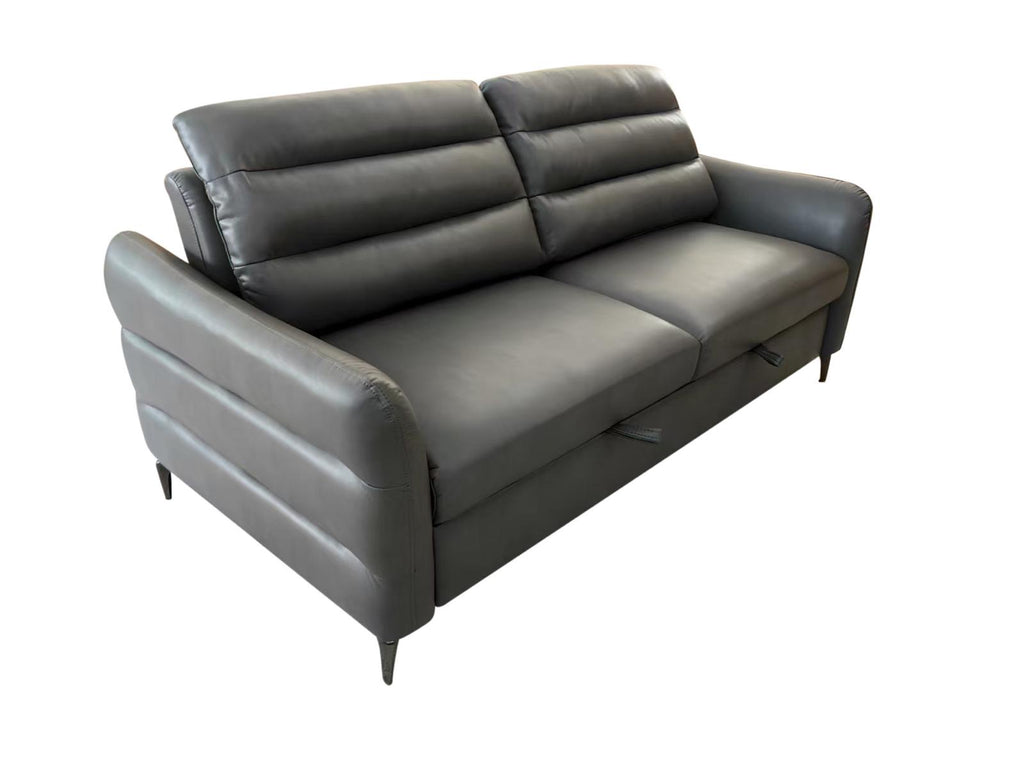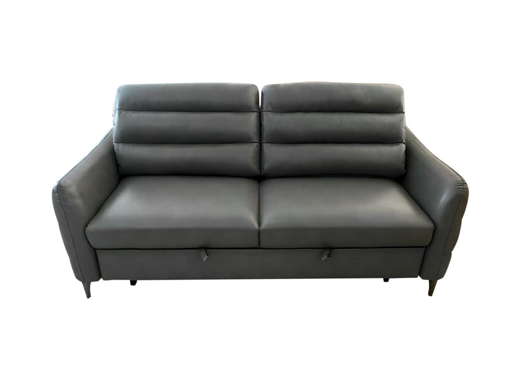 A contemporary-style sofa bed upholstered in sleek, dark grey faux leather or leatherette. It features generously padded, horizontally segmented backrests... A contemporary-style sofa bed upholstered in sleek, dark grey faux leather or leatherette. It features generously padded, horizontally segmented backrests that provide both comfort and visual appeal. The seat cushions are firm and deep, designed for durability and everyday use. The armrests are slightly curved and padded, adding to the sofa's overall comfort and modern aesthetic. Beneath the seat, there are pull tabs indicating a pull-out bed mechanism, allowing the sofa to easily convert into a sleeping surface when needed. The slim, black metal legs give it a lifted, airy appearance while maintaining stability. Ideal for modern homes or compact apartments, this sofa bed combines style, comfort, and practicality in one elegant piece. View more
